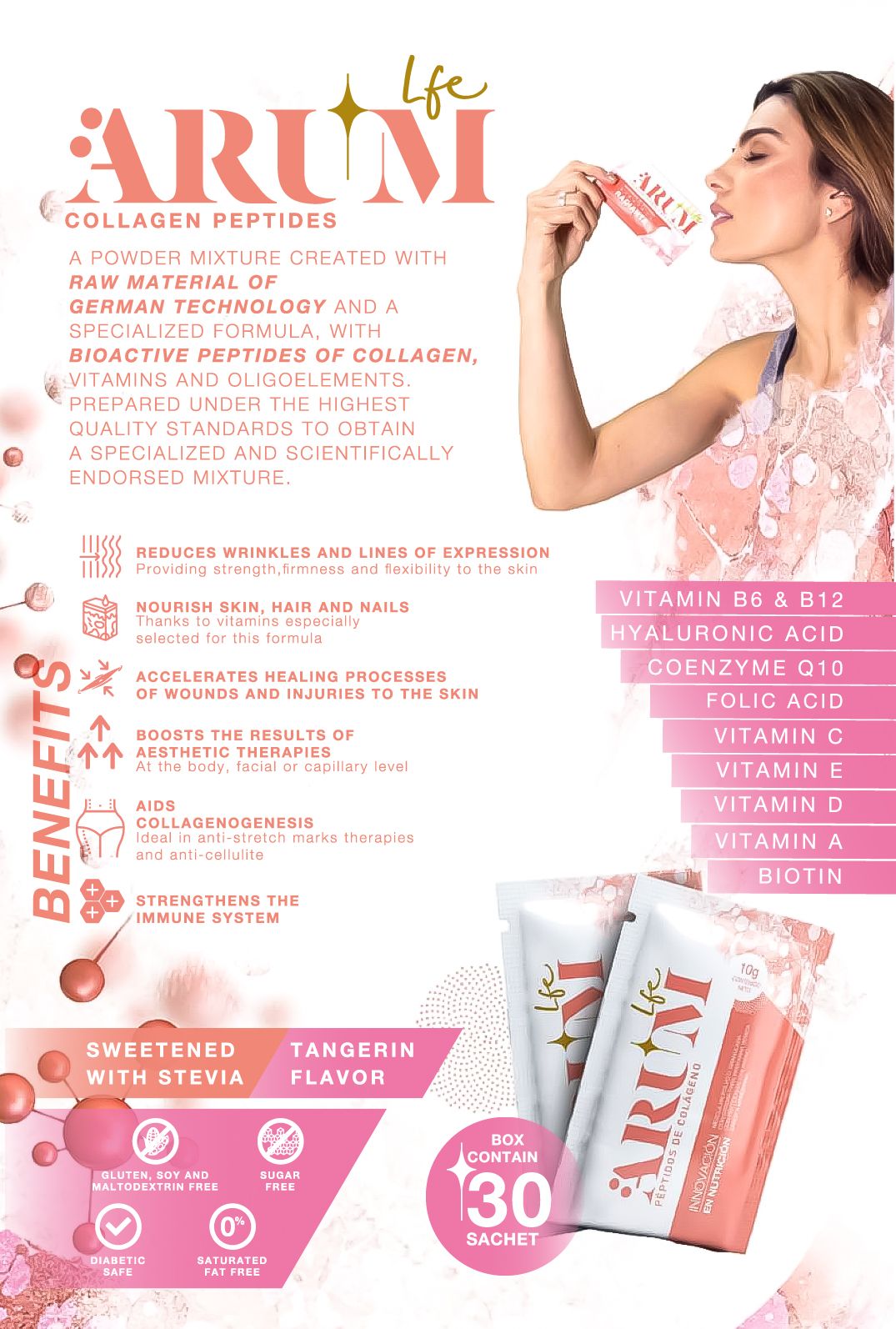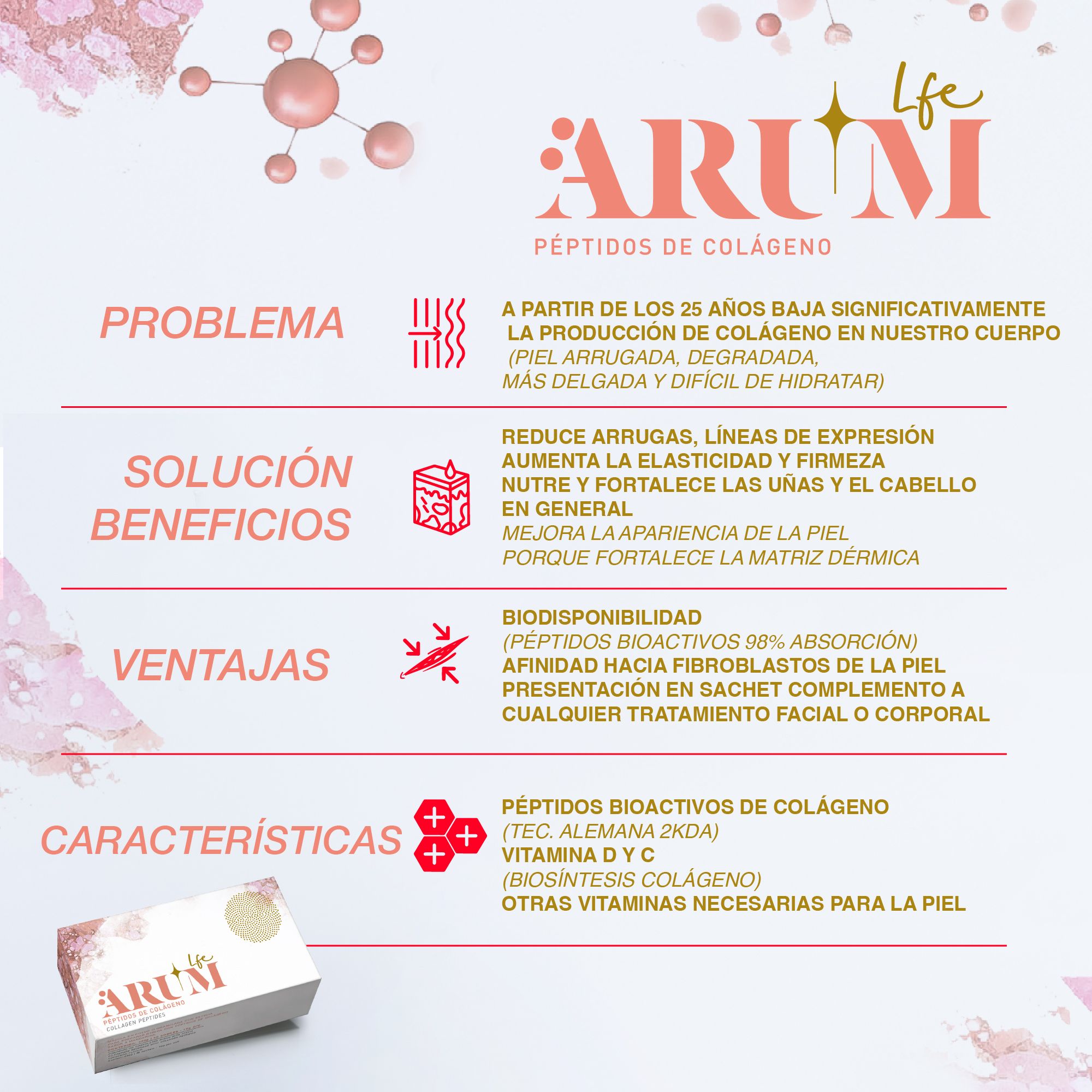 ARUM Life es una mezcla en polvo creada con materia prima de tecnología Alemana y una fórmula especializada con Péptidos Bioactivos de Colágeno, vitaminas y oligoelementos, elaborada bajo los mas altos estáandares de calidad para obtener una mezcla especializada y avalada cientificamente. Reduce arrugas y lineas de expresion aportando fuerza, firmeza y flexibilidad a la piel; Nutre la piel, el cabello y las uñas gracias a las vitaminas especialmente seleccionadas para esta formula; Acelera procesos de cicatrizacion de heridas y lesiones en la piel; Incrementa el resultado de cualquier terapia estetica a nivel corporal, facial y capilar; Coadyudante en procesos de colagenogenesis, ideal en terapias anti-estrias, y anti-celulitis; Refuerza el sistema inmunologico.